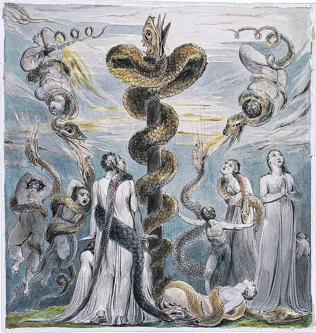 The story goes like this: the Israelites were complaining about their survival needs (survival needs are predominantly running the lower chakras in Indian traditions until awakened consciousness transmutes them), so God sent ‘fiery snakes’ to destroy them (the awakening of the kundalini energy in the lower chakras perhaps?). When they started praying for mercy, God told Moses to place a copper snake on a pole. When the Israelites gazed upon this strange object, they were cured of their suffering. Could this be a hidden teaching metaphor in the bible?